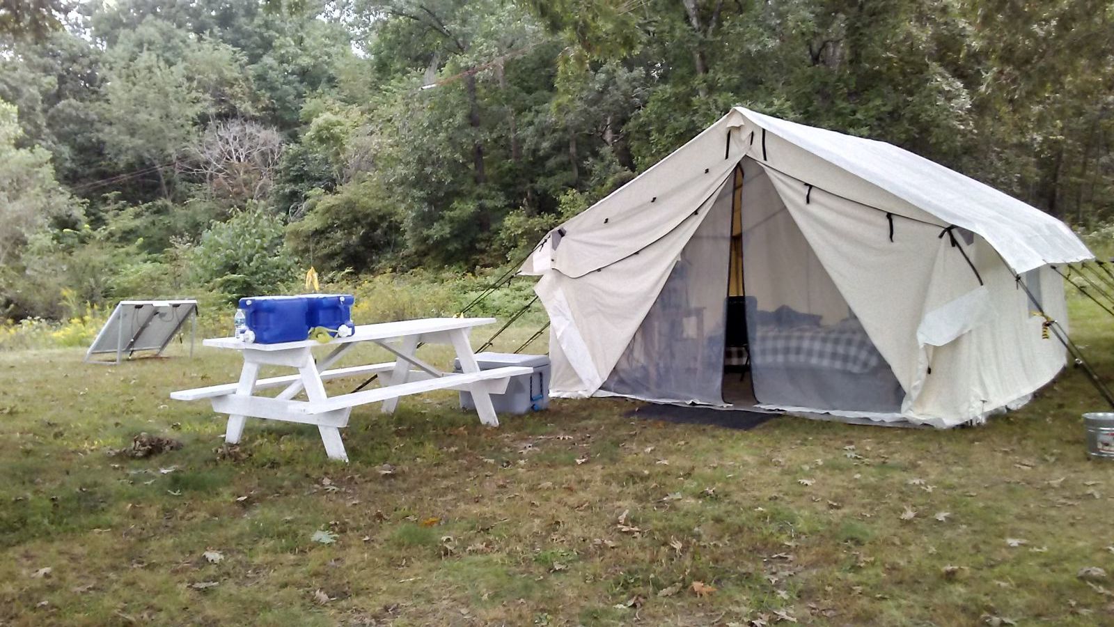 In the wall tent power is created by two Renogy 100w monocrystalline panels in series, EPEver MPPT 30A charge controller, and Napa 100ah AGM battery.